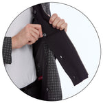 – Mezcla suave y resistente de poliéster con viscosa, con patrón microcuadros que aporta textura y carácter.